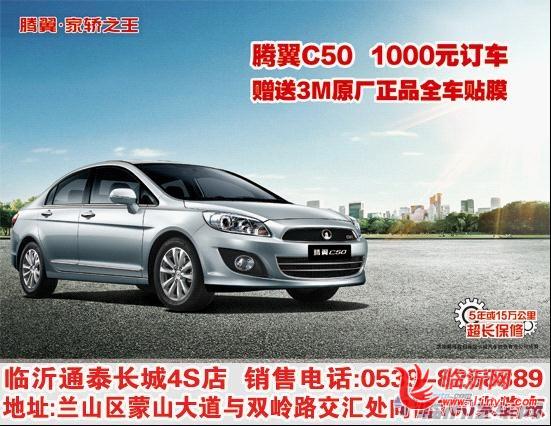 长城汽车全新家轿——腾翼C50 1.5T涡轮增压车型以7.8万-9.18万的价格震撼上市。腾翼C50定位“全尺寸 T家轿”,以独有的涡轮增压技术和超越同级车型的配置成为自主品牌的标杆车型,在外观上,腾翼C50造型大气、时尚,有着成熟家轿的气质。此外,腾翼C50推出5年或15万公里+4次免费保养服务,刷新了同级别车型记录,为消费者带来更多优惠。即日起交纳1000元现金预定腾翼C50,即可获赠3M原厂正品全车贴膜。