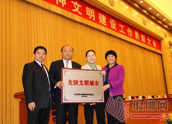 中共中央政治局常委、中央文明委主任李长春出席并讲话,中共中央政治局委员、书记处书记、中宣部部长、中央文明委副主任刘云山主持会议,中共中央政治局委员、国务委员、中央文明委副主任刘延东宣读了表彰决定。大会上,共有14个地级市荣获全国文明城市称号,我市名列榜首。市委书记、市人大常委会主任张少军上台领奖,市委常委、宣传部长李建华参加会议。