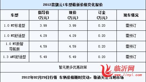 近日,编辑从奇瑞汽车临沂九州4S店内了解到,2012款旗云1现车到店,目前接受预订中,订金2000元。感兴趣的网友不妨到店赏车或者电话咨询。具体车型及报价请参见下表: