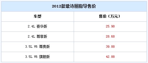 编者语:不管歌诗图在之前有怎样不尽人意的市场表现,2012款通过2.4L车型来补充战线对于未来该车系的市场竞争力还是有所帮助的,加上不错的通过性与丰富配置水平,对于之前由于预算等问题没有考虑购入3.5L歌诗图的消费者而言是个不错的选择。