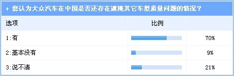 大众汽车对DSG问题的遮掩与拖延也使得公众对其可能隐瞒了其他质量问题产生了怀疑。根据我们调查的投票结果,大众汽车还存在遮掩其他车型质量问题的可能性并不小,约70%的业内人士持此类观点。同时,有21%的认为很难根据大众在DSG质量问题上的隐瞒,就判定大众汽车还存在其他的质量问题,而应该依据事实与标准来举证。此外,也有9%的人肯定地认为大众汽车基本不存在其他车型质量问题。