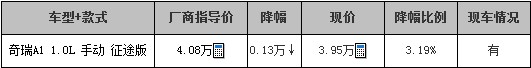 近日,搜狐汽车编辑从奇瑞汽车临沂地区经销商处了解到,目前店内奇瑞A1征途版车型有现车,购车可享受1300元优惠。感兴趣的朋友不妨到店内了解详情。