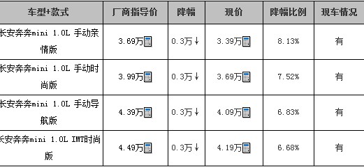 近日,搜狐汽车编辑于临沂地区某长安汽车4S店了解到,现在购买长安奔奔mini可享现金优惠3000元。现车方面:目前店内现车充足,颜色齐全。店内有试驾车,可试乘试驾。欢迎感兴趣的朋友到店详细。