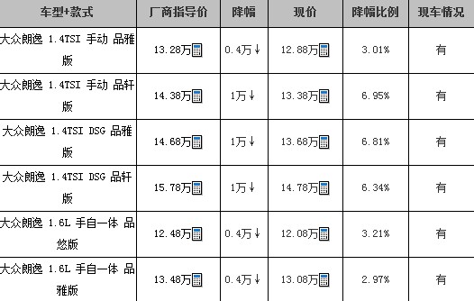 近日,搜狐汽车编辑于临沂地区上海大众汽车经销商,临沂金羊4S店了解到,现在购买2011款朗逸低配车型可享4000元现金优惠,高配车型可享10000元现金优惠。现车方面:目前店内现车较为充足,颜色有黑色和香槟金。店内有试驾车,可试乘试驾。欢迎感兴趣的朋友到店详询。