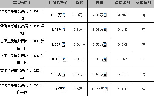 现在购买两厢版雪佛兰爱唯欧可享现金优惠5000元,1.4L车型可另外享受3000元节能惠民补贴,综合优惠最高8000元。现车方面:目前店内现车较足,颜色也齐全。店内有试驾车,欢迎感兴趣的朋友到店赏车试驾。