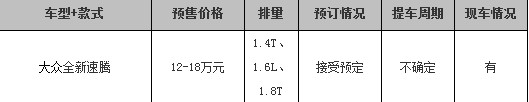 全新速腾展车已经到店,因尚未有官方售价,所以现在仅接受预定。订金为2千元。