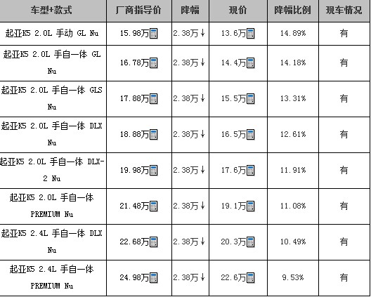 目前店内K5现车较为充足,现在购买这款车型可享受2.38万元的现金优惠,并可获赠价值6200元的装饰礼包。店内配有这款车的试驾车,感兴趣的朋友不妨到店内了解详情。
