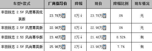 近日,汽车编辑从临沂地区某一汽丰田4S店了解到,现在购买锐志可享20000元现金优惠。现车方面:目前店内低配车型没有现车,购车预定需交定金10000元,约两周后提车,其它车型库存较为充足。另外,店内有试驾车,可试乘试驾。欢迎感兴趣的朋友到店详询。