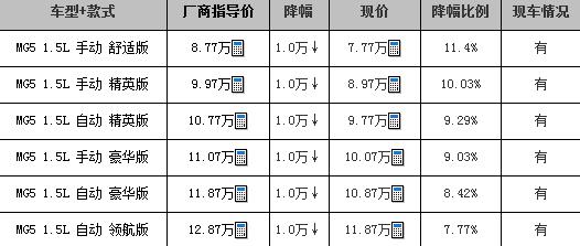 近日,汽车编辑从上汽MG某4S店了解到,店内MG5有现车销售,购车可享10000元现金优惠。店内车型较齐全,颜色以黑色、灰色、白色为主。可以预订,订金5000元,提车需等待3周左右。感兴趣的朋友不妨到店详谈。