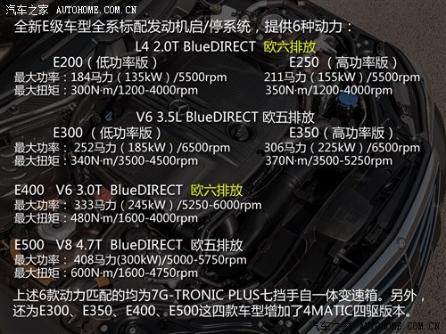 在动力方面,奔驰新款E级将会有多种发动机以满足不同的市场需求,其中入门级车型E200和E250搭载的是2.0升涡轮增压发动机,最大功率分别为184马力和211马力;而E300和E350搭载的是3.5升发动机,最大功率分别为252马力和306马力;最后是动力更为强劲的E400和E500车型,两款车搭载的分别是3.0T和4.7T发动机,最大功率输出分别为333马力和408马力。以上车型均匹配的是一台7速手自一体变速箱。奔驰新款E级Coupe版将会推出哪些具体车型,我们还需等待官方日后公布。