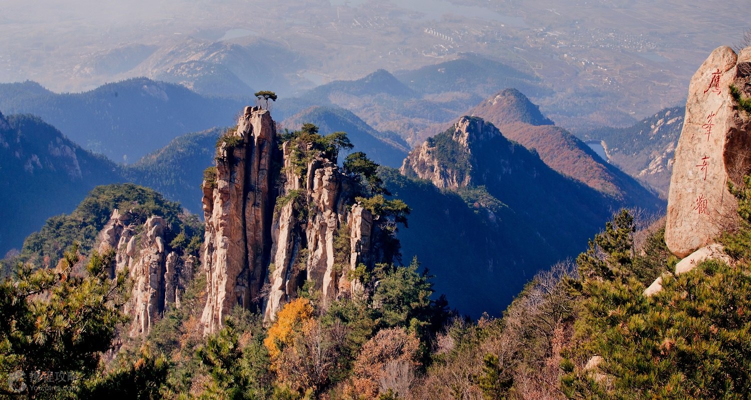 鹰窝峰是龟蒙景区的一大标志性景观,这座山峰绝壁如削,而峰顶生长着数棵千姿百态的松树,整个山峰远看 就像一个巨大的盆景,非常漂亮。沿石阶继续上行可到圣贤亭,这座山亭立于悬崖边,亭上悬“东鲁在望”匾额,当年孔子登临蒙山时曾在此小憩。