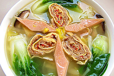 材料:蛋卷适量 白菜芯适量 黄瓜适量 火腿适量 香菇适量 韭黄适量 鸡汤适量 盐适量 猪油适量