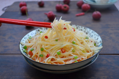 用料:土豆300克,白醋适量,贵州风味豆豉适量,盐适量,味精适量,葱蒜适量,红椒适量