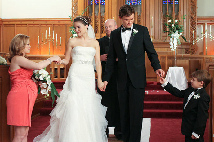 《篮球兄弟(One Tree Hill)》中,Sophia Bush的婚纱来自BCBG。简洁的白色礼服,带一点小拖尾的感觉,非常适合户外婚礼,头纱营造出了浪漫的婚礼氛围。