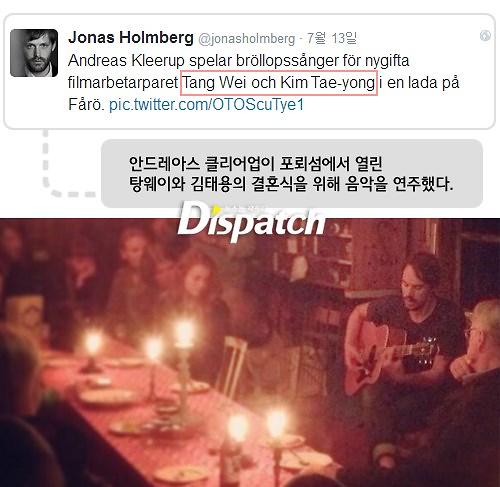 Jonas Holmberg随后发推特称“在法罗岛为汤唯和金泰勇的婚礼演奏了祝歌”,但从上传的照片上未能看到汤唯和金泰勇的身影,只有桌上的蜡烛和红酒,以及正在演奏吉他的Jonas Holmberg。