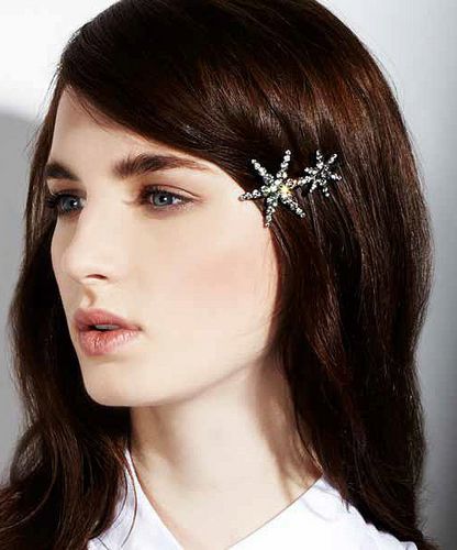 叶子形状的发饰可以作为盘发造型的点缀之物,特别是对于深色头发的人来说,盘发很容易显得有点老气,而带上这种BLING BLING效果的发饰就能立马起到点睛的作用。