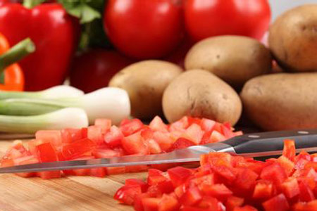 其实在切辣椒时,可以用手指肚按着辣椒,而不是用指甲掐住辣椒,这样手就不容易被烧到了。