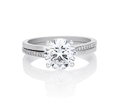 经典的铂金底座与圆形明亮型单颗美钻或公主方车工单颗美钻皆能完美搭配。总克拉数取决于中央钻石,外加大约 0.1 克拉密镶钻石。