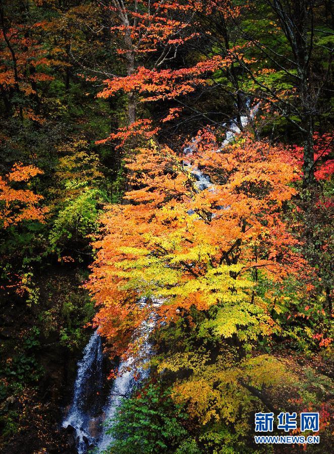 一叶落知天下秋。从枝头那一片落叶开始,秋天就这样走进了我们的视线。2010年11月1日,在日本松本市的一个度假胜地,瀑布的水流从挂满红叶的树木间穿过。 新华社/法新