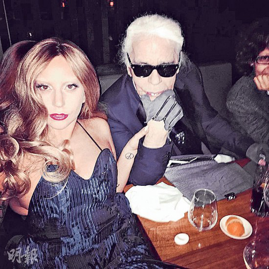 据香港“明报”报道,Lady Gaga正身在巴黎出席时装周活动,更相约时装设计大师“老佛爷”Karl Lagerfeld吃饭,虽然后者向来不爱自拍,但也托腮与LadyGaga合照,并上传网络。