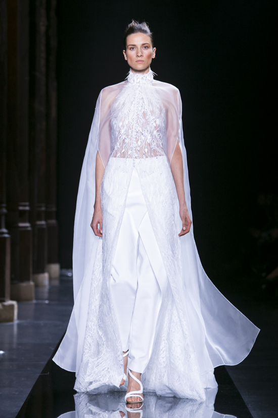 气场强大的新娘除了着裤装婚纱外,还可以搭配一件披风。为了不要显得过于霸气,面料上还是多些透视感来增加唯美度吧。