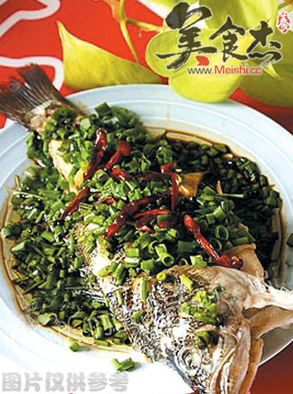 1、鲈鱼切下头、尾,从中段背部剖开成2大片,每片斜切成6小片,然后用精盐、酒、胡椒粉、味精腌一下,香菇泡软对切成12片; 2、鱼头、尾排开置于盘中,鱼肉、香菇、火腿、笋片各取一片组成一组,共12组,排好后放入蒸笼中蒸8分钟,精盐、味精、水、香油、淀粉勾芡淋在蒸好的鱼面上即可。