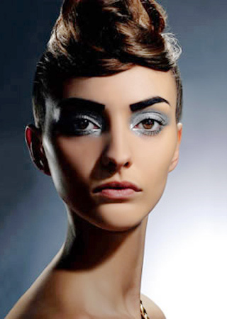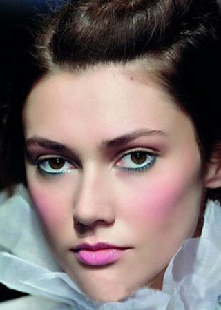 明亮、漂亮的色彩大面积交互晕染是今季眼妆的一大特色。妆效仿佛一幅水彩画,要点在于颜色要像明黄、粉紫、天蓝、果绿这样鲜亮,晕染面积要大,边界甚至可以突破到眉毛里,而妆感要薄薄一层,双色或三色的交汇处过渡非常柔和,没有边界。下眼睑可以选择撞色,沿睫毛根部着重涂抹,与上眼睑的轻薄晕染呼应。