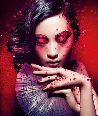 解析:精细与浅淡是关键词。亚洲人的眼睛很难驾驭红色,特别是大面积的晕染,因此,用眼影刷蘸取红色眼影淡淡晕染下眼线部位以及上眼尾处最为精彩,这点小小改变会让你的眼神带点妖娆意味,在烛光下别具风情。