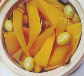 南瓜切成菱形片状后焯水,白果焐油。把南瓜片、白果加入冰糖、精盐、水,入煲小火炖制1小时即可。
