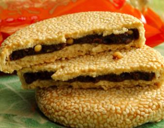 2.将皮、馅各摘成定量的小块,逐一将馅包入皮内,将每5只饼坯搭起(撒上扎白粉,防粘),稍揿扁将圆边在台板上滚动,用手指边薄、边滚转,以达到圆边光滑。最后沾上冷水,双面粘上芝麻即成。