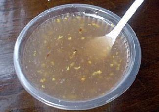 2)、然后冲入225克沸水,边冲边搅(搅至粉呈玉色并且没有粉粒时),加入白糖(50克),再将糖桂花(0.5克)均匀地撒在藕粉上;
