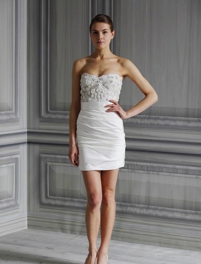 这款婚纱的裙子可长可短,新娘如果娇小可爱,裙子过膝就足够了。在更正式的场合中及地的长裙比较合适。