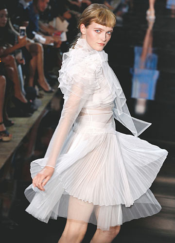 通过清透欧根纱蜿蜒曲折,制造蓬松廓形与细腻光感。走动时裙摆自然浮动,轻盈的空气感迎面而来,营造清新梦幻的气质。
