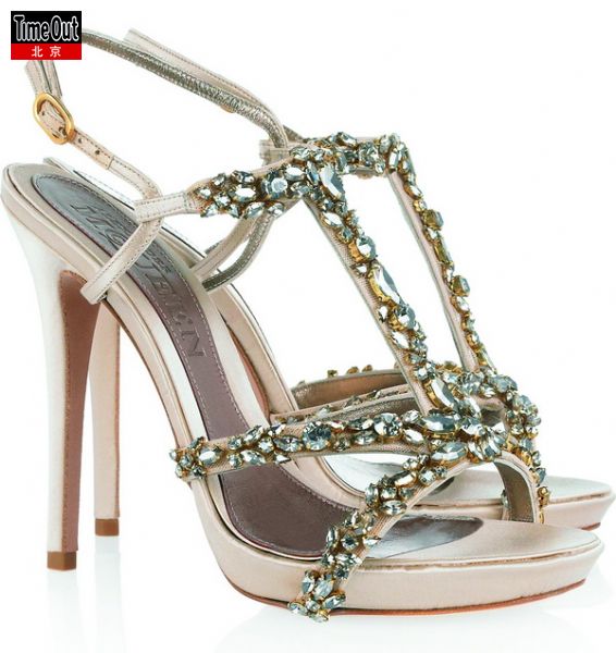漂亮的香槟色高跟凉鞋上镶嵌着大小不一的水晶,如同脚上的珠宝,让鞋子具有了优雅亮丽的外表。适合搭配短款新娘婚纱礼服,再加上亮色指甲油,让脚上的美丽也在众人面前绽放光彩。
