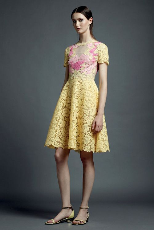 柠檬黄色蕾丝小礼服,粉色的花朵提亮礼服。
