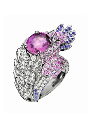 从著名的双翼飞马获得灵感,打造出一款诱人的高级珠宝戒指。飞马是希腊海神波塞冬的下属。传说,无论何处,只要翼马的蹄子踏在地上,地上就会淌出泉水。为使大海和天空相融合,工匠制作的飞马有流动鬃毛和翅膀,上面铺满的宝石闪闪发光,另有宝石嵌在雄伟的马头部位。鬃毛和环翼之间镶嵌着一块精致的中央宝石。