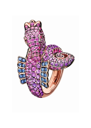 化身为珠宝的海马,已被赋予了丰富的色彩,从粉、蓝双色宝石,到紫水晶和红宝石,色彩斑斓,目不暇接。在粉金底盘上,海马造型能栩栩如生,因为它有不凡的设计,作品运用的金线,表现海马身体的不同部分。小精灵高贵的头置于戒指的顶部,身体环绕着手指,下面还有一条紧紧蜷缩的小尾巴,色彩缤纷,着实地迷人。