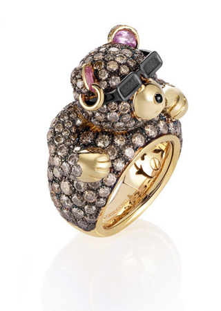 小熊造型戒指:黄金戒指镶嵌305颗棕色钻石重9.97克拉,2颗粉色蓝宝石重达0.39克拉。