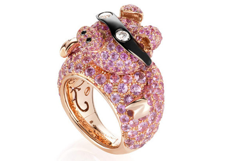 小猪造型戒指:玫瑰金和镀黑的黄金,镶嵌2颗白色钻石共0.22克拉,367颗粉色蓝宝石共10.95克拉。