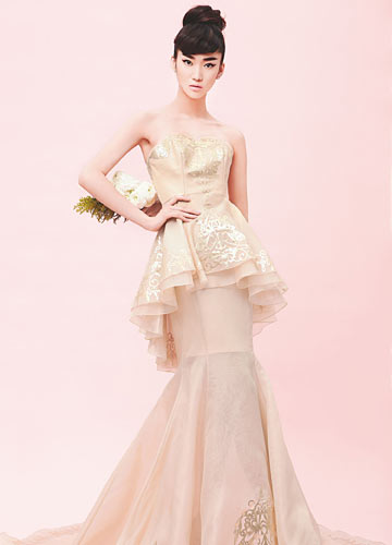 中国唐代的传统元素与刺绣工艺是最独一无二的,青瓷瓶造型的立体剪裁,能让穿着的窈窕身姿一览无余,中国元素的现代演绎手法充满韵味,作为东方新娘,在任何场合,都能彰显出大气婉约的女性气场。