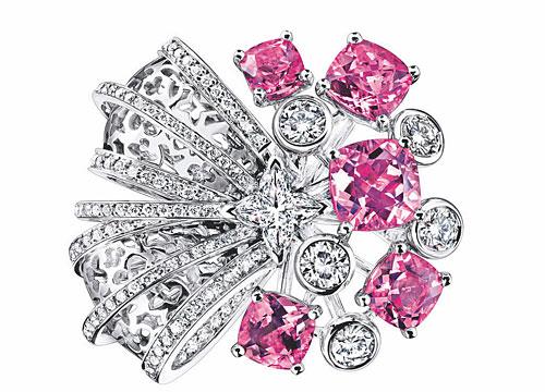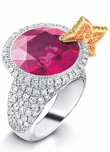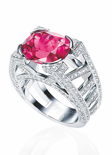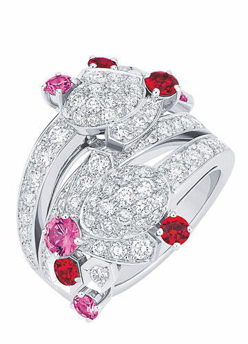 设计灵感:特殊的造型及特环形砌石技术,使得红色水晶石和深粉色蓝宝石让钻石蜜蜂显的更为耀眼和栩栩如生。