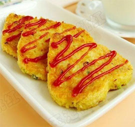 3、平底锅内放油,油五成热时,把搅好的糊糊用匙舀入锅里,摊平成饼状,我用的是心形煎蛋器。煎黄一面以后,翻面煎另一面,两面都煎黄即熟时出锅