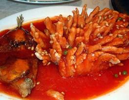 6. 炒锅置旺火,注入花生油,烧至六成热,下"桂鱼"炸约8 分钟,呈金黄色时,用漏勺捞出,有鳞、鳃形的一面朝上,放入长盘中;