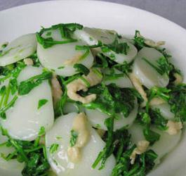10、加入荠菜碎炒匀后,加些盐和鸡精调味,最后淋些香麻油翻炒均匀即可出锅。