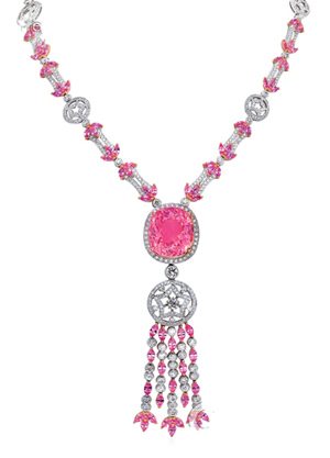 流苏感设计很强的一款新娘吊坠式项链,红色的宝石与镶钻的白金相搭配让新娘颈间散发出一股迷人的红色,红色的宝石让这款新娘吊坠式项链增加了浓浓的优雅味道。