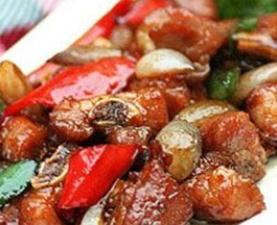 4. 将圆葱下锅,煸2分钟左右,再放入猪排,加上酱油、黄酒、糖、味精、肉清汤50克,烧沸后移至小火上烧约3分钟,再移至旺火上将卤汁收浓,淋上熟花生油即可起锅;