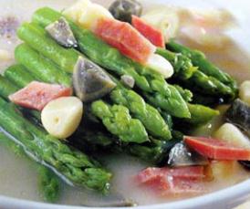 芦笋200克,金华火腿30克,皮蛋1个,葱、姜、蒜米适量