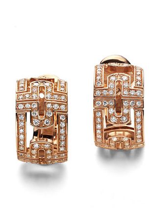 由黄金和钻石组合而成,黄金表面经过抛光,颜色类似玫瑰金的颜色,显得很奢华。将小颗粒的钻石均匀的分布在宝格丽的黄金LOGO中,将奢华与大气完美的在新娘的耳尖完美的展现。