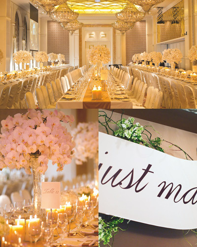 流行理由:酒店宴会厅式的婚礼仍然是婚礼主流,在明年的室内婚礼中,淡金色将释放无穷光芒。这种华贵的颜色比耀眼的金色要柔和许多,更不会剑拔弩张地抢走新人的风头。搭配柔和的乳白色和非常浅的粉色,绝对能营造出童话中的宫殿感觉,却内敛、宁静。当淡金色作为主体的时候,切忌用太多颜色辅衬,一至两种温暖的淡彩色就已经足够。