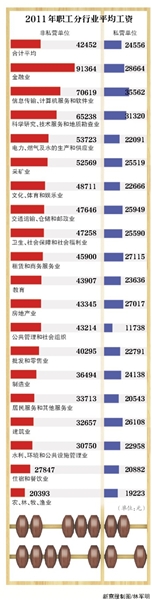 数据显示,无论是非私营单位还是私营单位,最高工资行业和最低工资行业都非常一致,金融业、信息产业和地质勘探等行业的工资水平均为行业翘楚,而农林牧渔、住宿餐饮和社会组织这些行业的工资水平则较低。与2010年相比,高工资、低工资行业基本没有变化。
